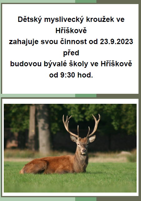 Dne 23.9.2023 opět zahajuje svou činnost Myslivecký kroužek pro děti, sraz v 9:30 hod před budovou bývalé školy ve Hříškově.