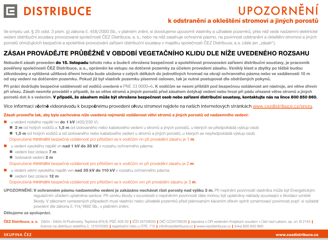 UPOZORNĚNÍ k odstranění a okleštění stromoví a jiných porostů